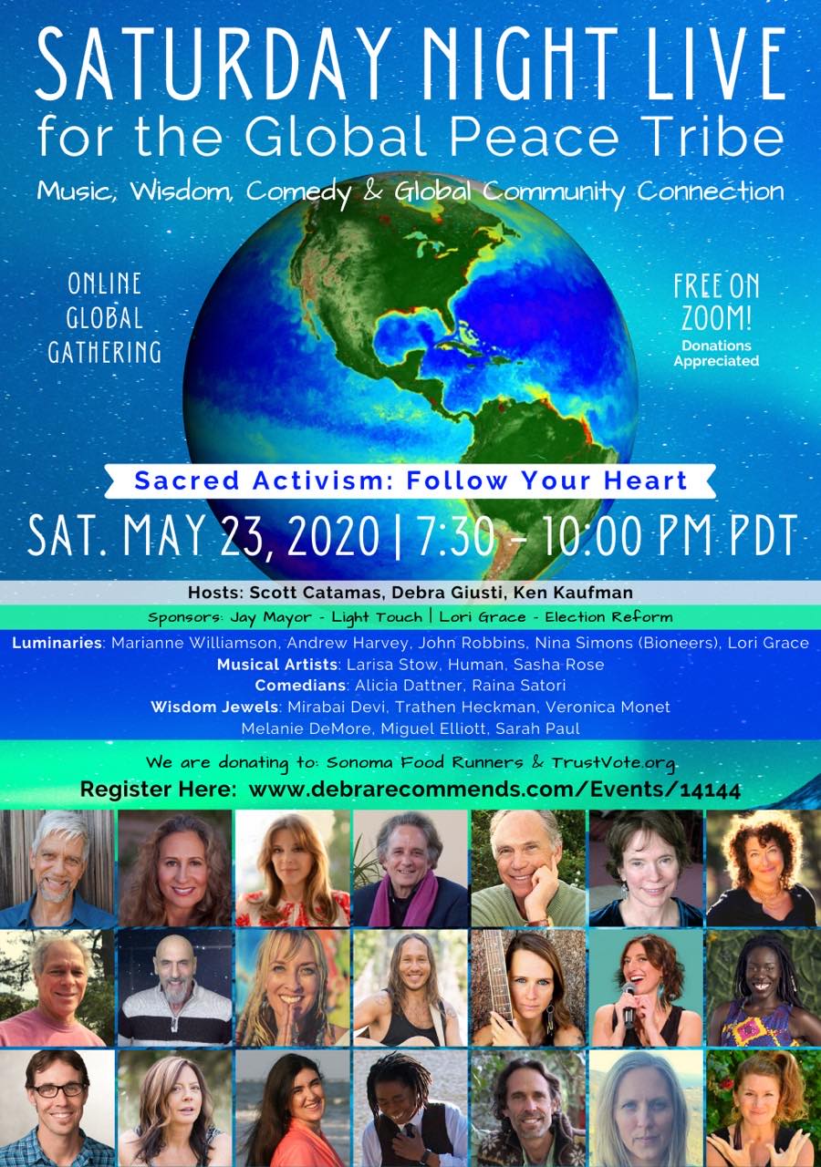 Saturday Night Live for the Global Peace Tribe is the mecca for conscious, heart-centered, transformational community to gather online from across the globe for nourishing and soul-inspiring talks, music and connection during this unprecedented time.
